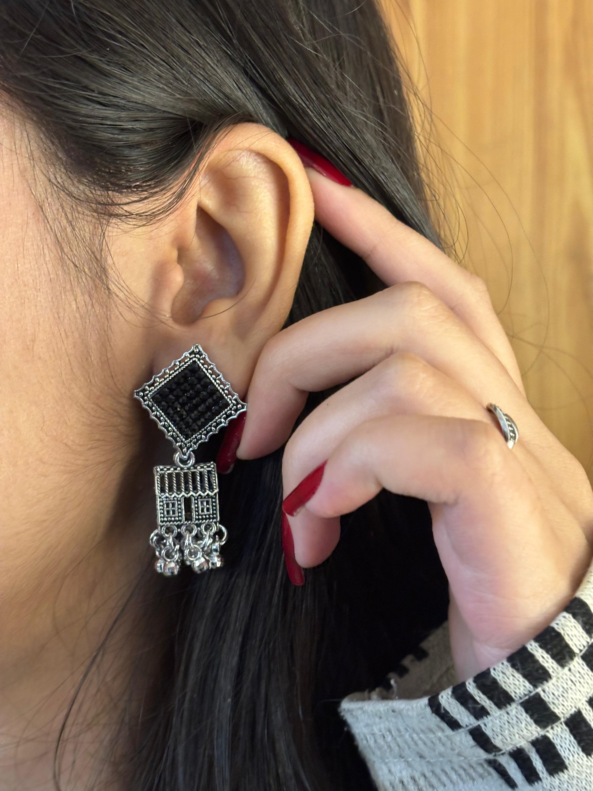 - Silver square & chain jhumka earrings β Square oxidised stud paired with chain-linked mini jhumkas for a layered look.