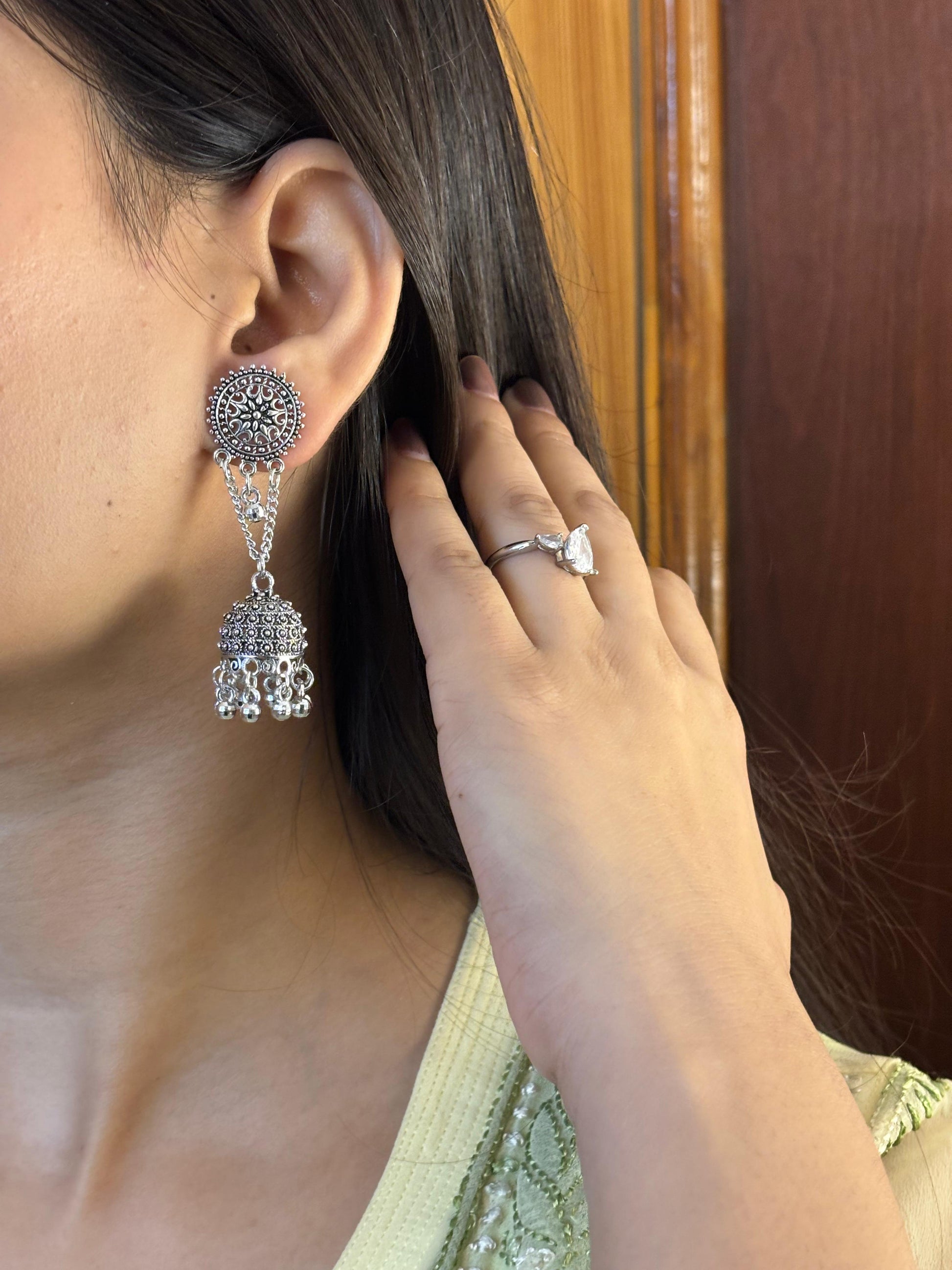 - Oxidised floral jhumka earrings β Flower-shaped stone stud with dome jhumka detailing.